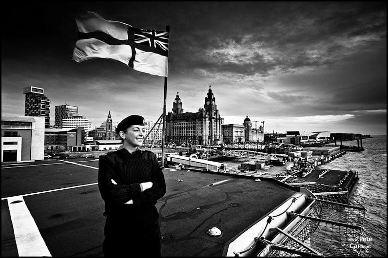 A classic B&W from you Pete, I love these. Great tones and contrast with just the right amount of lighting on the flag and the girl’s face. I’m wondering what you were stood on though. Maybe would have liked a bit more separation between the girl, flagpole and (Liver?) building perhaps but you’d probably be in the drink before you got it.