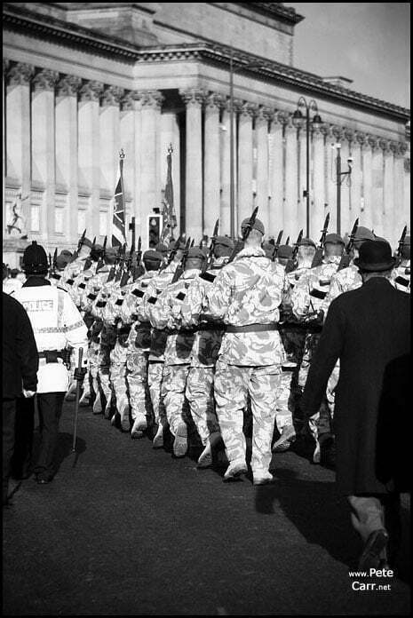 200 Irish Guards marched through the city centre yesterday. They had returned from Iraq and marched from the Anglican Cathedral to St Johns gardens for a memorial was unveiled. It was great to see people cheering and clapping in support for them. I must have looked like I got quite emotional at one point because I got something in my eye and it was watering so badly I had to take my hat off and wipe it. Just in case anyone saw me, etc.