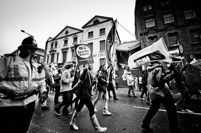 Back in September I photographed a trade union protest against the cuts by the government. While it started off small the crowd grew and grew by the Anglican Cathedral before moving down Duke St towards the Albert Dock. By the time they reached the end of Duke St it was pouring down. Over by the Albert Dock a stage had been setup for speeches when the protestors arrived. People there were waving flags and making their presence known to the passing traffic on the Strand.