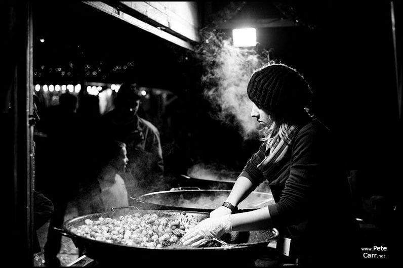 Fantastic; the steam really adds sense of atmosphere – you can almost feel the cold. I like the way the girl is isolated by the surrounding black, with the customers mysterious and only partly seen at the edge of the light.